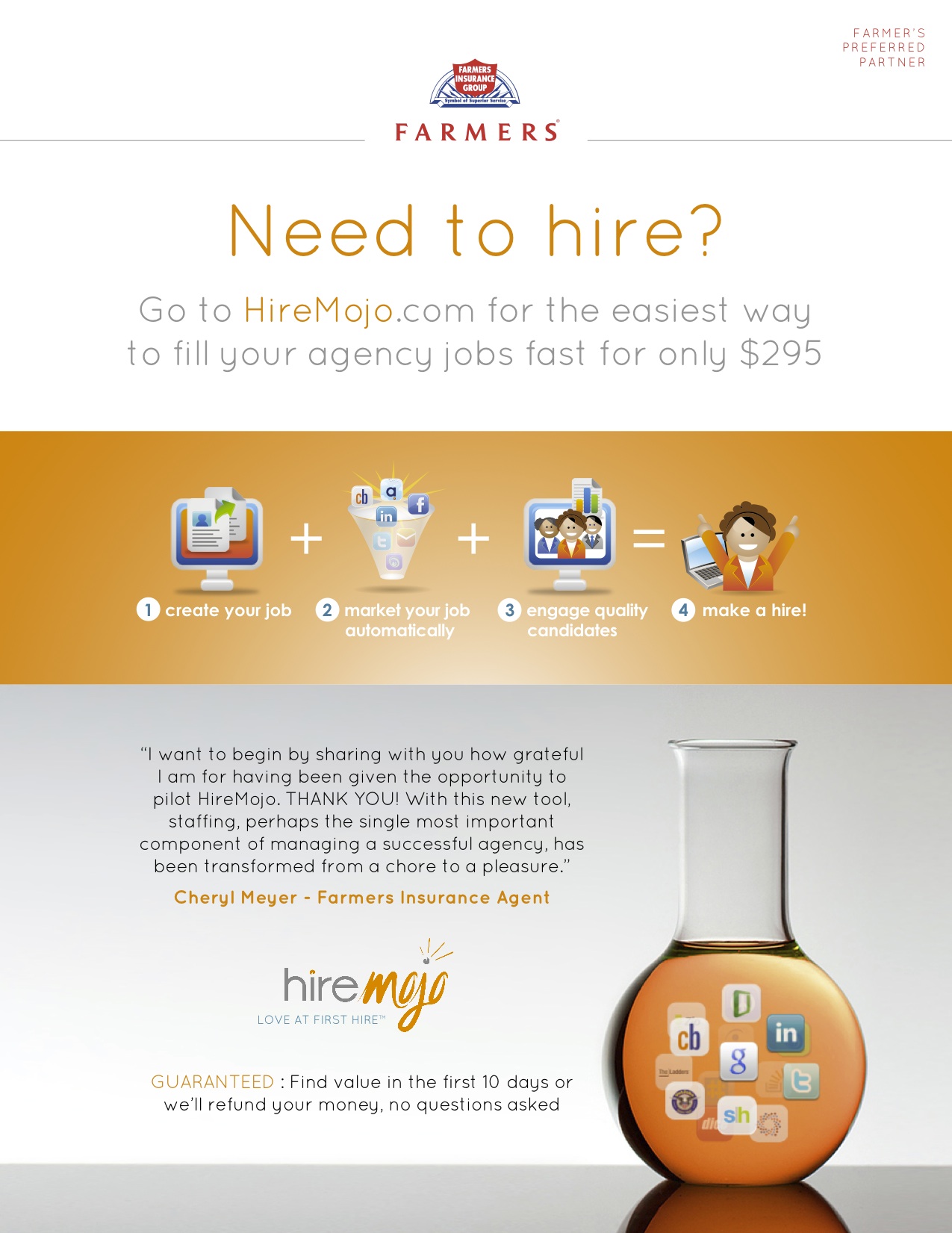 HireMojo is the revolutionary Google-like hiring platform that helps companies find great talent in less than two weeks for $295. We developed the entire brand identity, campaign theme, print, video and website.